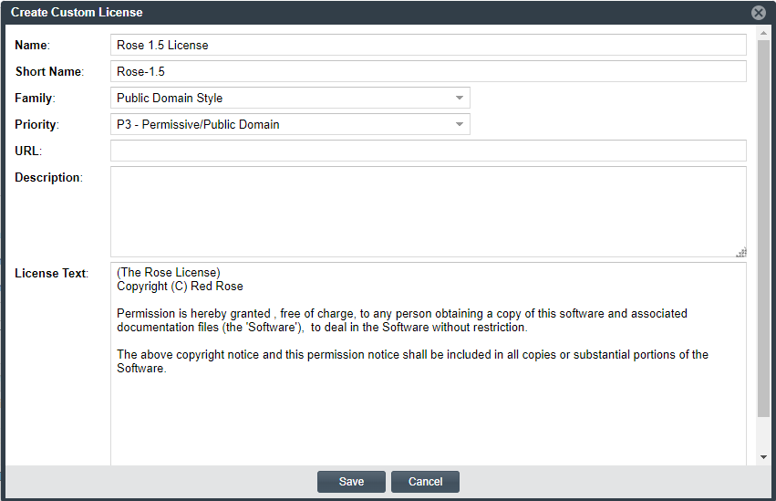 1. From the Create Custom License window, provide the license properties. Name , Short Name , and License Text are required fields. For a description of the properties, see Custom License Properties.