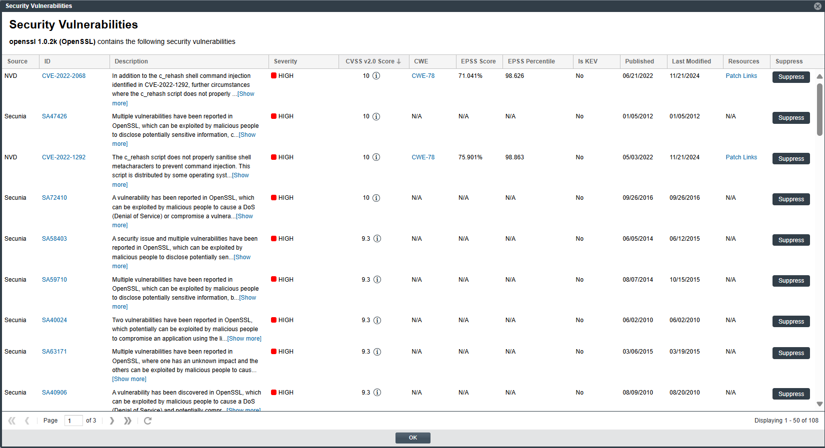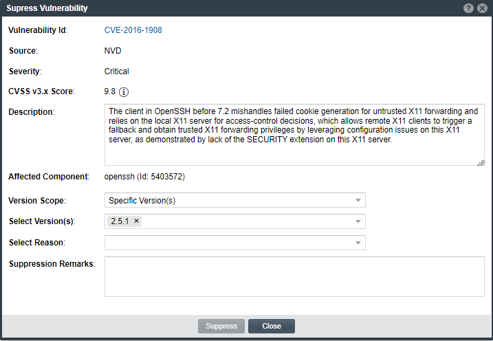 The following procedure is used to suppress a security vulnerability for one or more (or all) versions of an OSS or third-party component associated with your inventory.