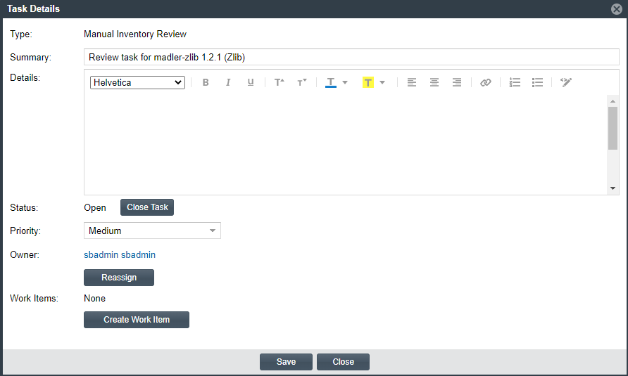 3. To update the task fields or add an external work item, refer to the descriptions in Manually Creating a Task.